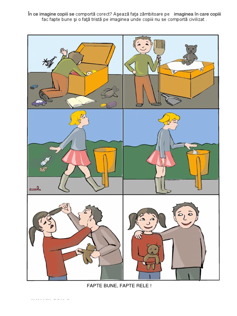 Ce E Bine Ce E Rău In Ce Imagine Copiii Se Comportă Corect Unește Faţa Zambitoare Cu Imaginea In Care Copiii Fac Fapte Bune Si Fața Tristă Cu Imaginea Unde Copiii Nu